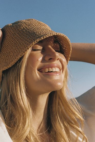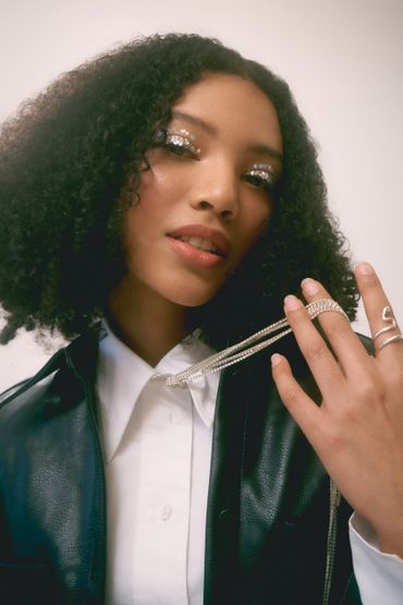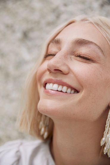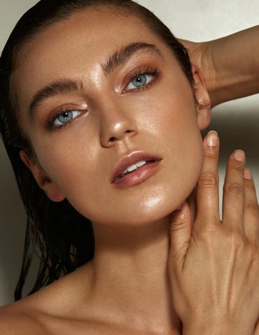 Model posing for a photo wearing natural glowy makeup