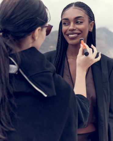 Beach photoshoot of a model wearing a natural makeup look
